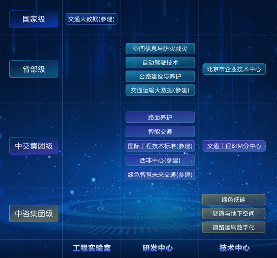 中咨集團一直秉承“追求卓越、敢為人先”的創新精神,深入實施創新驅動發展戰略,積極開展交通強國試點任務、科改示范行動。承建了空間信息應用、智能交通、智慧養護方向的交通運輸部行業研發中心,6個中交集團研發中心,自主成立3個中咨級專業技術中心,打造“四級三類”科技創新平臺體系。致力于成為中咨科技戰略的謀劃者、技術路線的設計者、技術開發的組織者和市場開拓的助力者,賦能公司九元業務板塊。